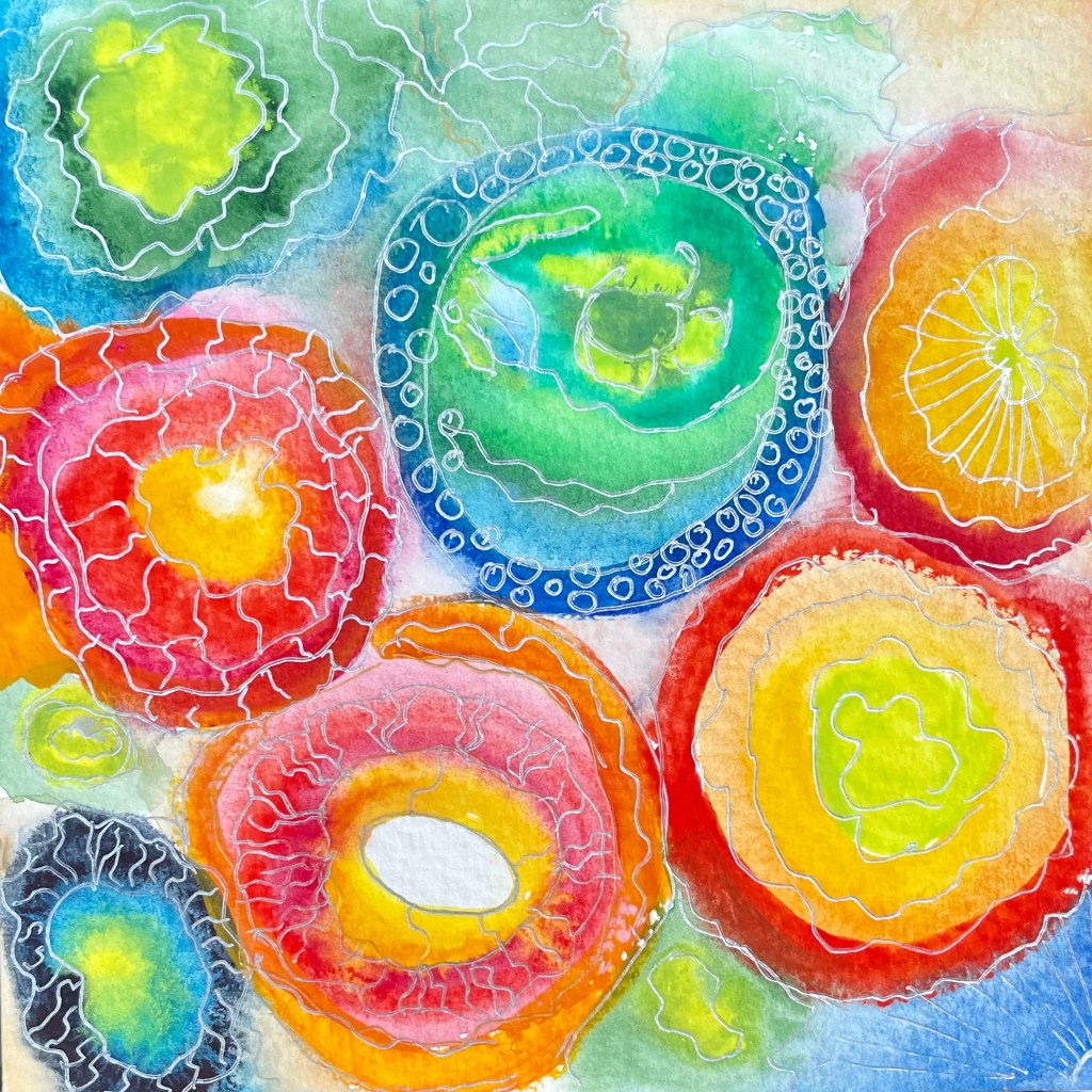Das intuitive Malen hat ein paar gute Effekte, denn es kann beruhigend wirken und dich deiner inneren Mitte nahe bringen. Ich halte das eigentlich immer für eine gute Maßnahme. Beispielsweise dann, wenn beim Schreiben des Buches, der Text nicht so ohne Weiteres aus mir herausfließen möchte. Es gibt verschiedene Methoden, wie vor dem Bildschirm auszuharren, bis es weiter geht oder etwas ganz anderes zu machen, um Abstand zu gewinnen. Gut, wenn ich es dann schaffe, mit Farben und Formen zu spielen. Meistens – eigentlich immer – sieht die Welt danach schon wieder anders aus und es fühlt sich für mich so an, als hätte ich plötzlich ganz andere Möglichkeiten und ich kann mit der Handlung im Buch flexibler und kreativer umgehen..