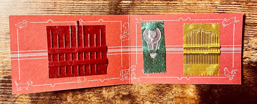 Im Plot geht es um Tessa und ihre Mutter Elisea. Während der Coronazeit halten die beiden sich gegenseitig hoch, indem sie oft telefonieren und gemeinsam die Familiengeschichte aufarbeiten. Elisea ist 1940 geboren und hat bis heute eine phänomenales Gedächtnis. Außerdem hat sie so gut wie alles aufbewahrt und zu den meisten ihrer Erinnerungen gibt es auch die passenden Gegenstände. So hat sie neulich erst ihr altes Nadelmäppchen, das sie als kleines Mädchen von ihrem Taschengeld gekauft hat, wiedergefunden. Bei ihrem Mäppchen steht der Preis noch in Reichsmarkt drauf – kaum 10 Pfennige. Die Nadelmappe oben im Bild konnte Tessa noch am gleichen Tag des Telefonates funkelnagelneu im Internet bestellen. Genau so sieht es heute noch aus. Mit Porto und allem Drum und Dran kam dieser Preis auf 7 €. Aber sie freut sich, dass sie es tatsächlich so unkompliziert bekommen konnte.